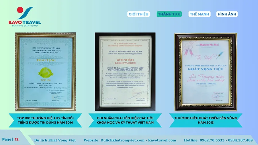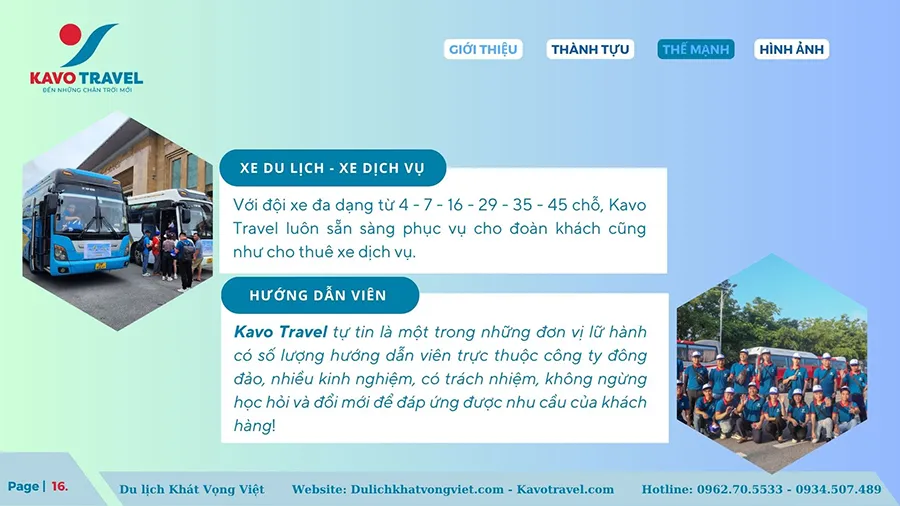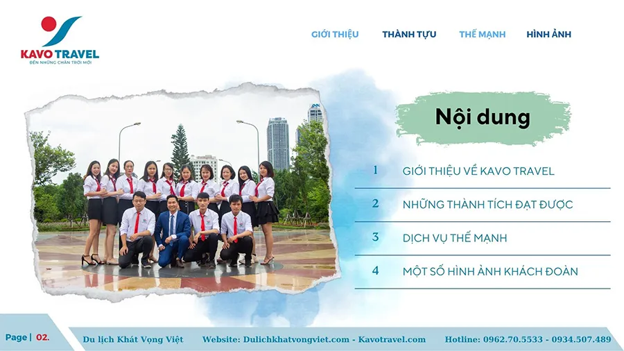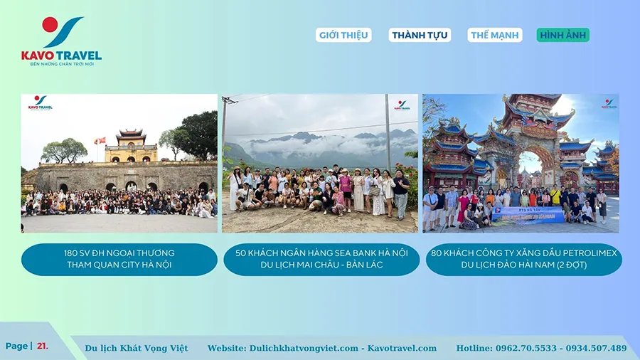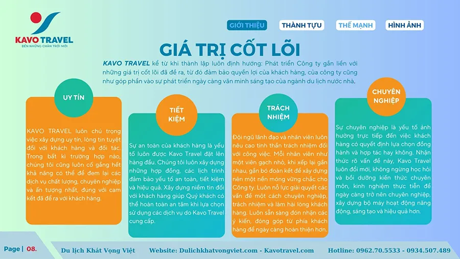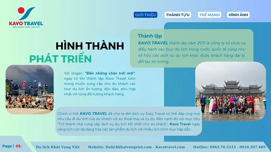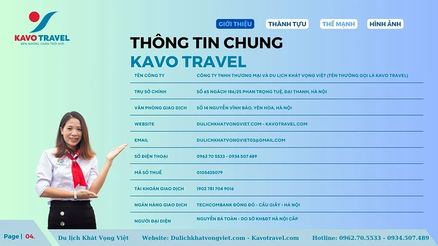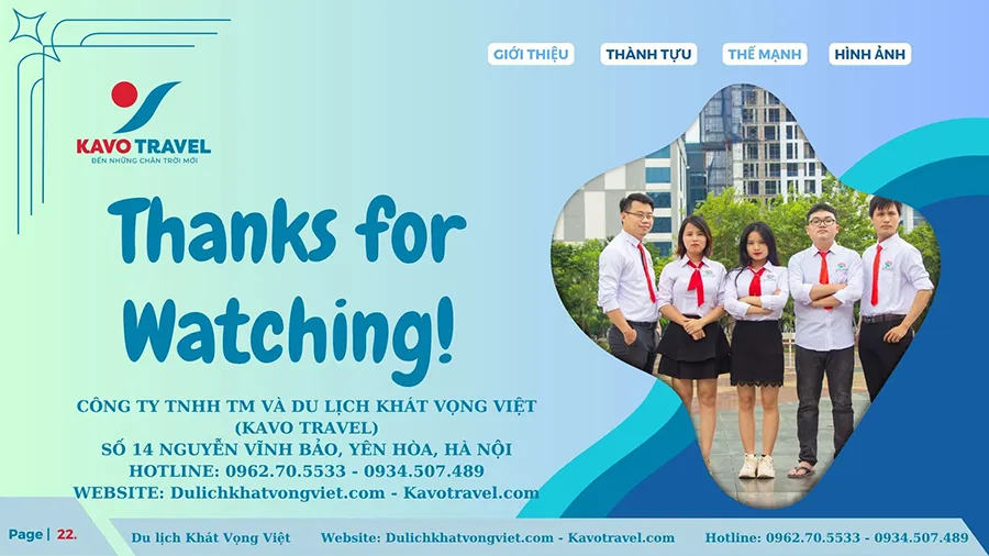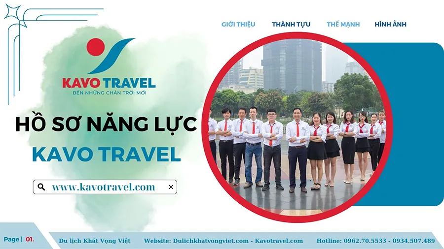 Cảm ơn quý khách hàng đã quan tâm và xem xét hồ sơ năng lực của Công ty TNHH thương mại và du lịch Khát Vọng Việt (KAVO TRAVEL). Là đơn vị với gần 15 năm kinh nghiệm và phát triển, Kavo Travel đã tổ chức nhiều tour du lịch chất lượng cho du khách trong và ngoài nước. Với sự uy tín, trách nhiệm, năng động, nhiệt huyết và chuyên nghiệp của cán bộ nhân viên, Kavo Travel luôn luôn đặt mục tiêu là làm hài lòng khách hàng, phục vụ tất cả du khách đến nơi, đến chốn, đặt lợi ích khách hàng lên hàng đầu. Chúng tôi cũng cảm ơn khách hàng đã và đang tin tưởng, lựa chọn dịch vụ của Kavo Travel. Hi vọng sẽ được đồng hành với Qúy khách trên mọi chuyến du lịch.