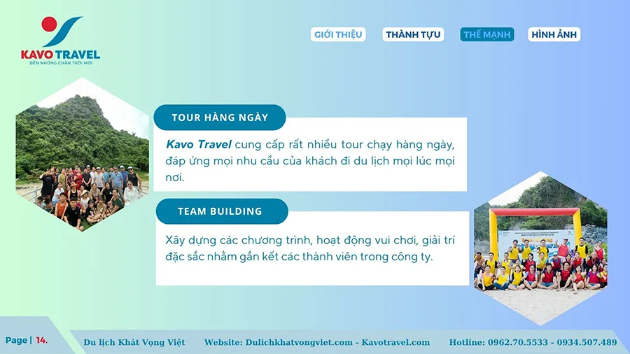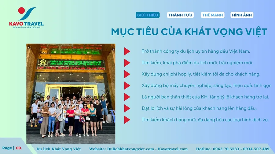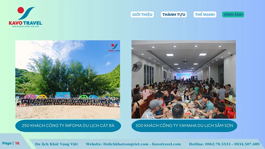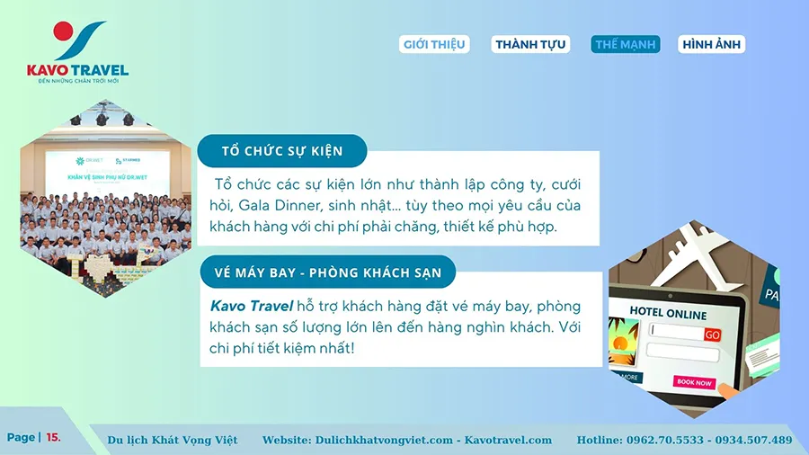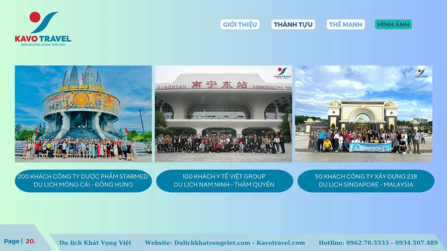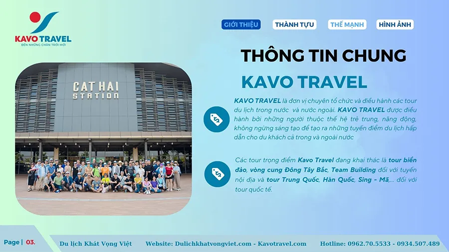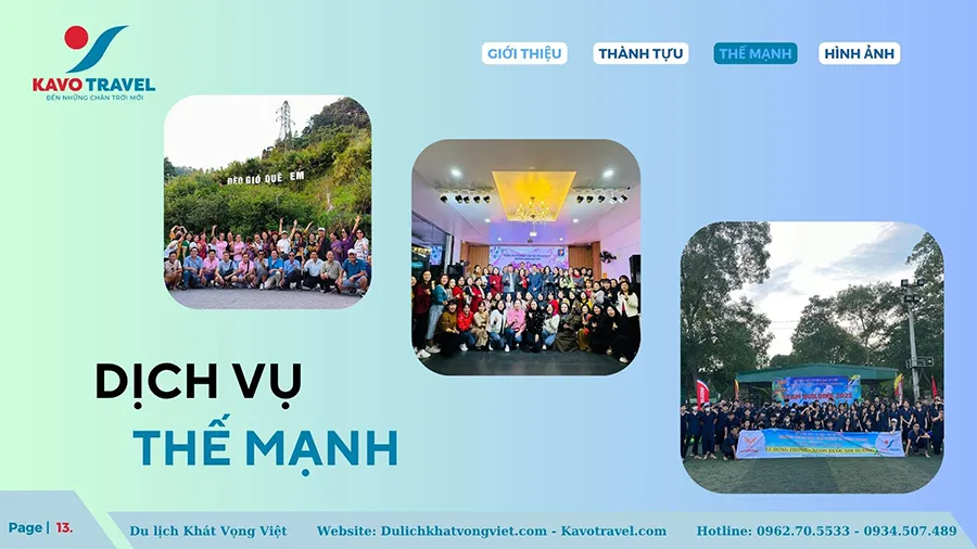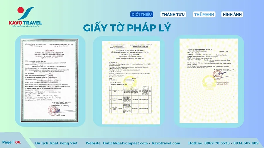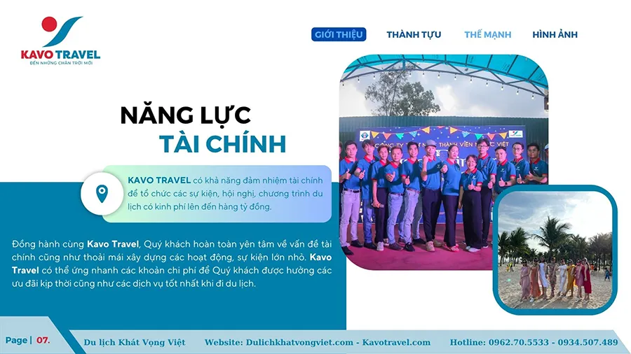 Cảm ơn quý khách hàng đã quan tâm và xem xét hồ sơ năng lực của Công ty TNHH thương mại và du lịch Khát Vọng Việt (KAVO TRAVEL). Là đơn vị với gần 15 năm kinh nghiệm và phát triển, Kavo Travel đã tổ chức nhiều tour du lịch chất lượng cho du khách trong và ngoài nước. Với sự uy tín, trách nhiệm, năng động, nhiệt huyết và chuyên nghiệp của cán bộ nhân viên, Kavo Travel luôn luôn đặt mục tiêu là làm hài lòng khách hàng, phục vụ tất cả du khách đến nơi, đến chốn, đặt lợi ích khách hàng lên hàng đầu. Chúng tôi cũng cảm ơn khách hàng đã và đang tin tưởng, lựa chọn dịch vụ của Kavo Travel. Hi vọng sẽ được đồng hành với Qúy khách trên mọi chuyến du lịch.